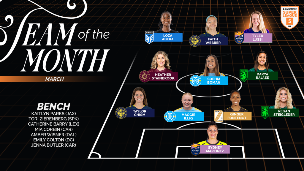 TAMPA, Fla. – The Gainbridge Super League today announced the Team of the Month for March, with Carolina Ascent forward Tyler Lussi named Player of the Month after helping lead her side to an undefeated run that has pushed the side toward its second consecutive postseason berth.